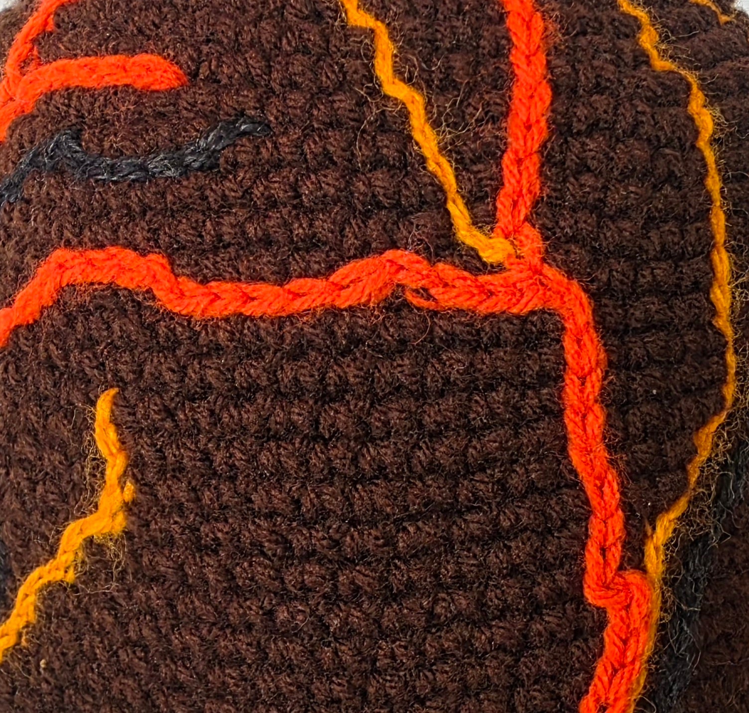 I am in love with this brown winter beanie and almost had to keep it for myself! It is hand crocheted with a deep brown and features blaze orange 3-D tree branches crocheted over top. So cool!