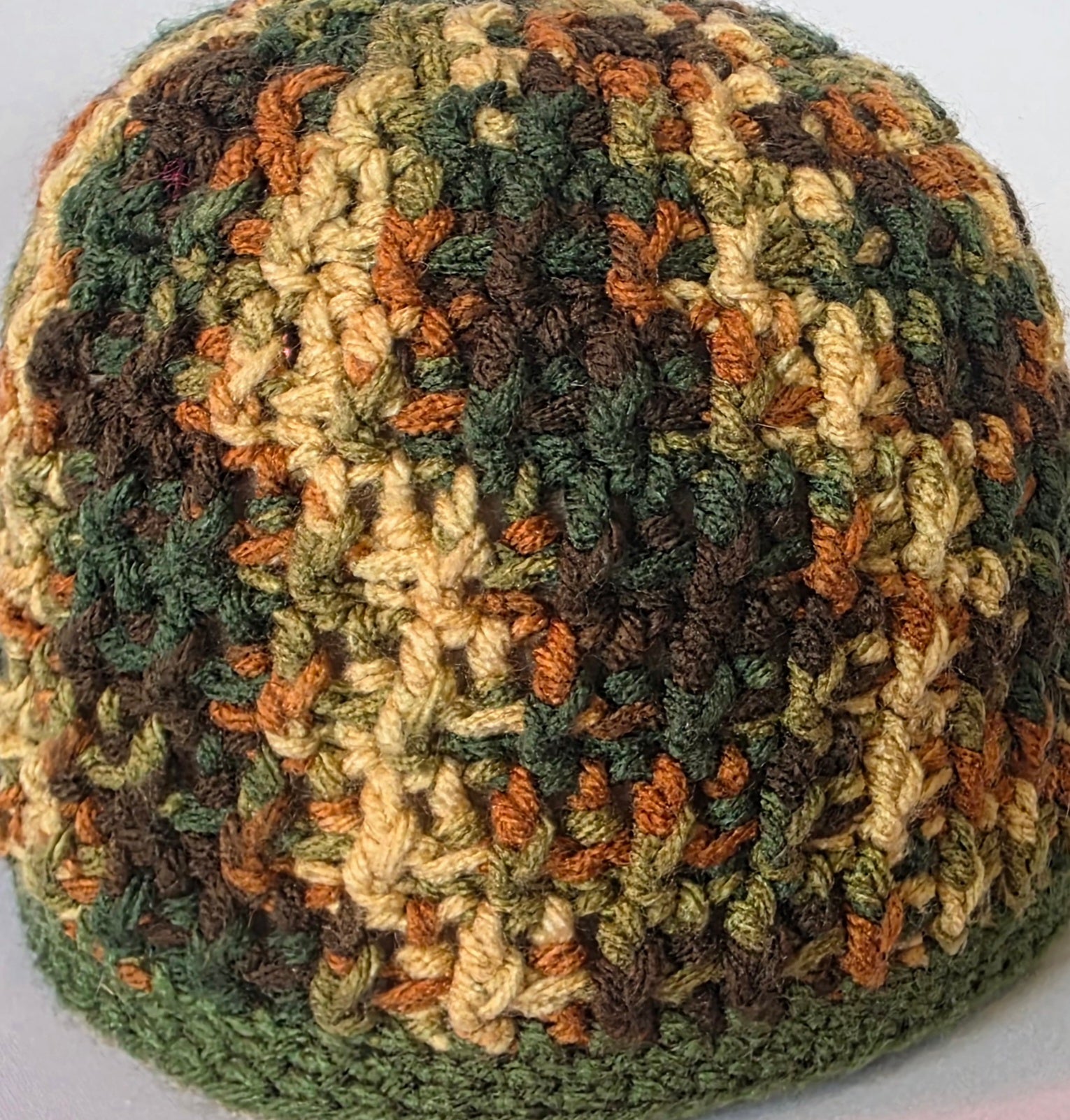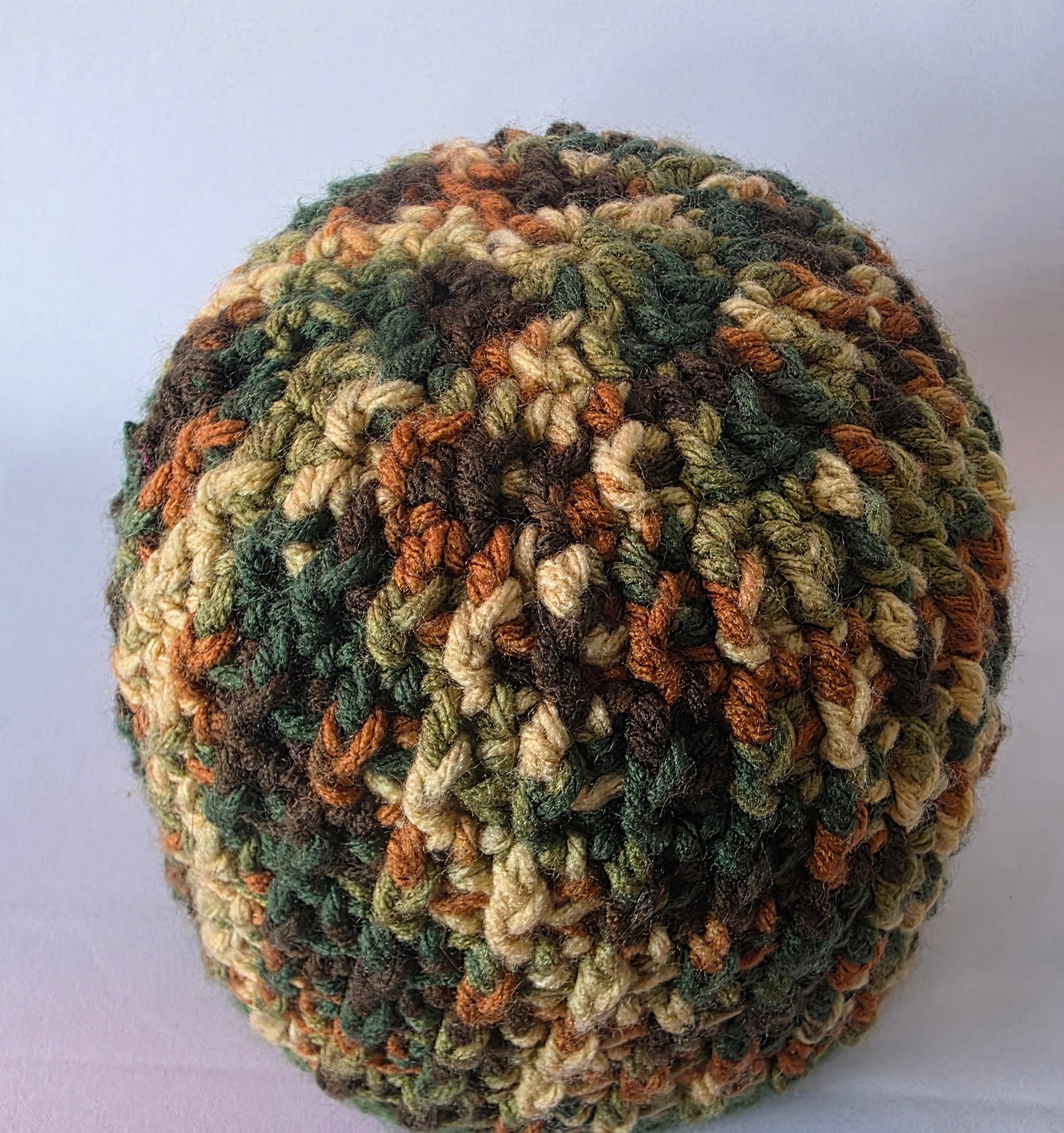 This versatile beanie is hand knitted with camo yarn in various greens with browns and creme.