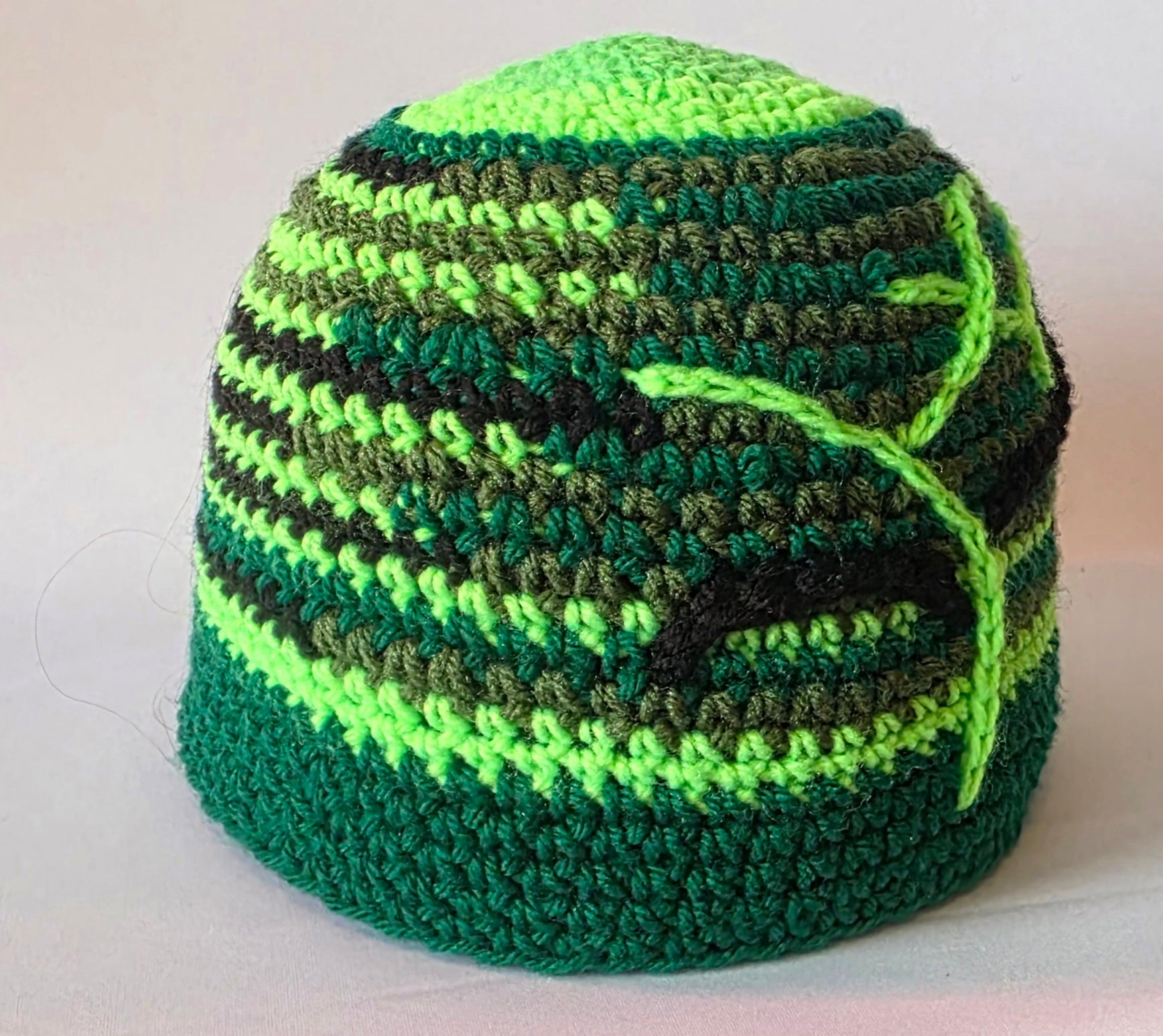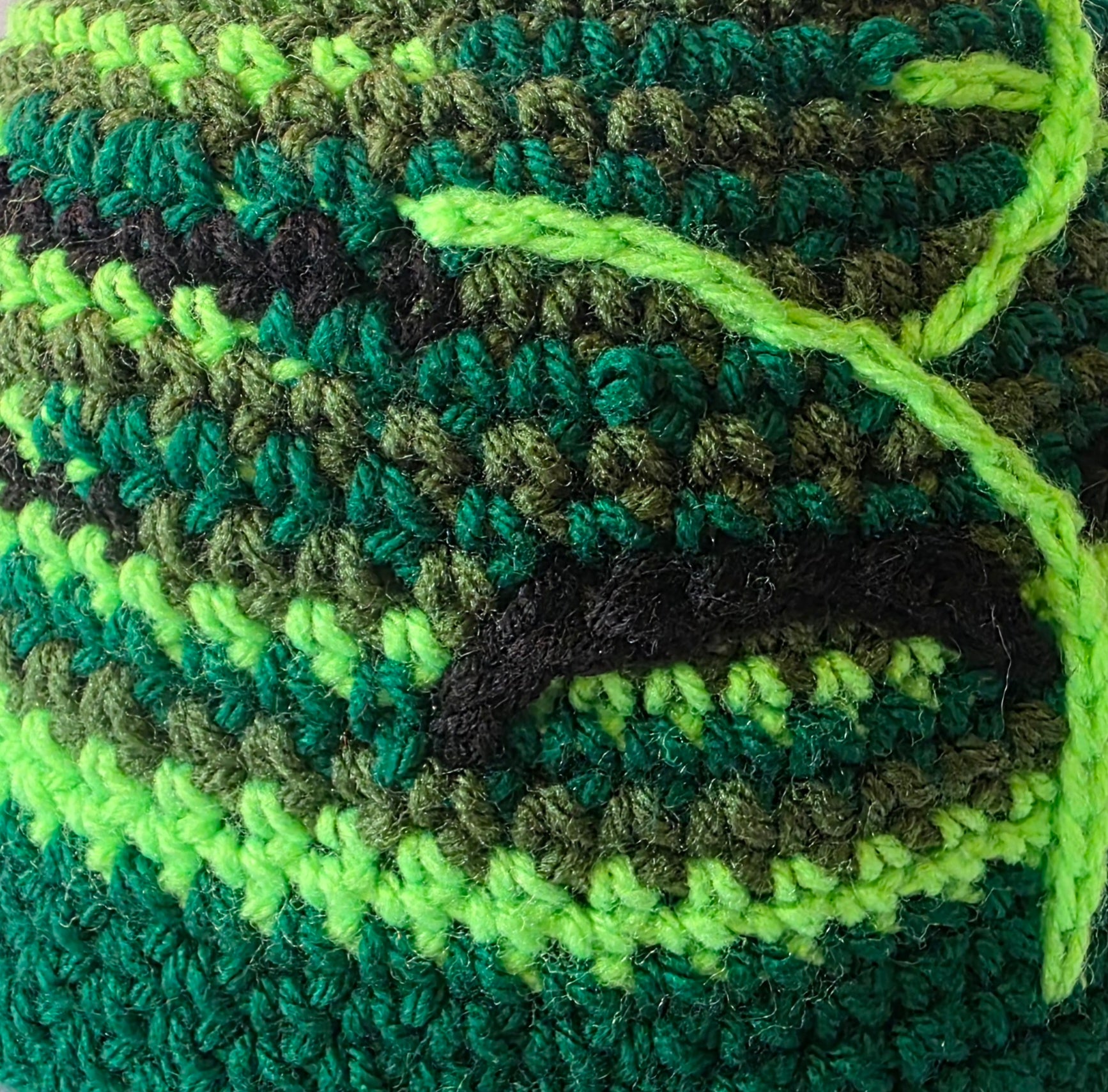 This RAD winter hat was hand crocheted with neon green, hunter green, olive and black in a striped camo layout. It has 3-D crocheted tree branches on one side of the beanie.